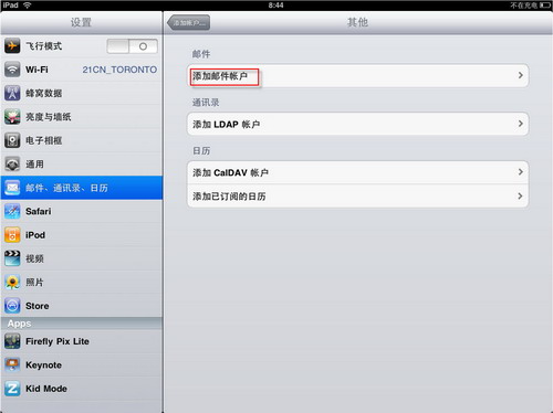 2、 进入iPad设置页,点击左边的“邮件、通讯录、日历”菜单,右边出现邮件、通讯录、日历的详细配置页,点击“添加账户”;